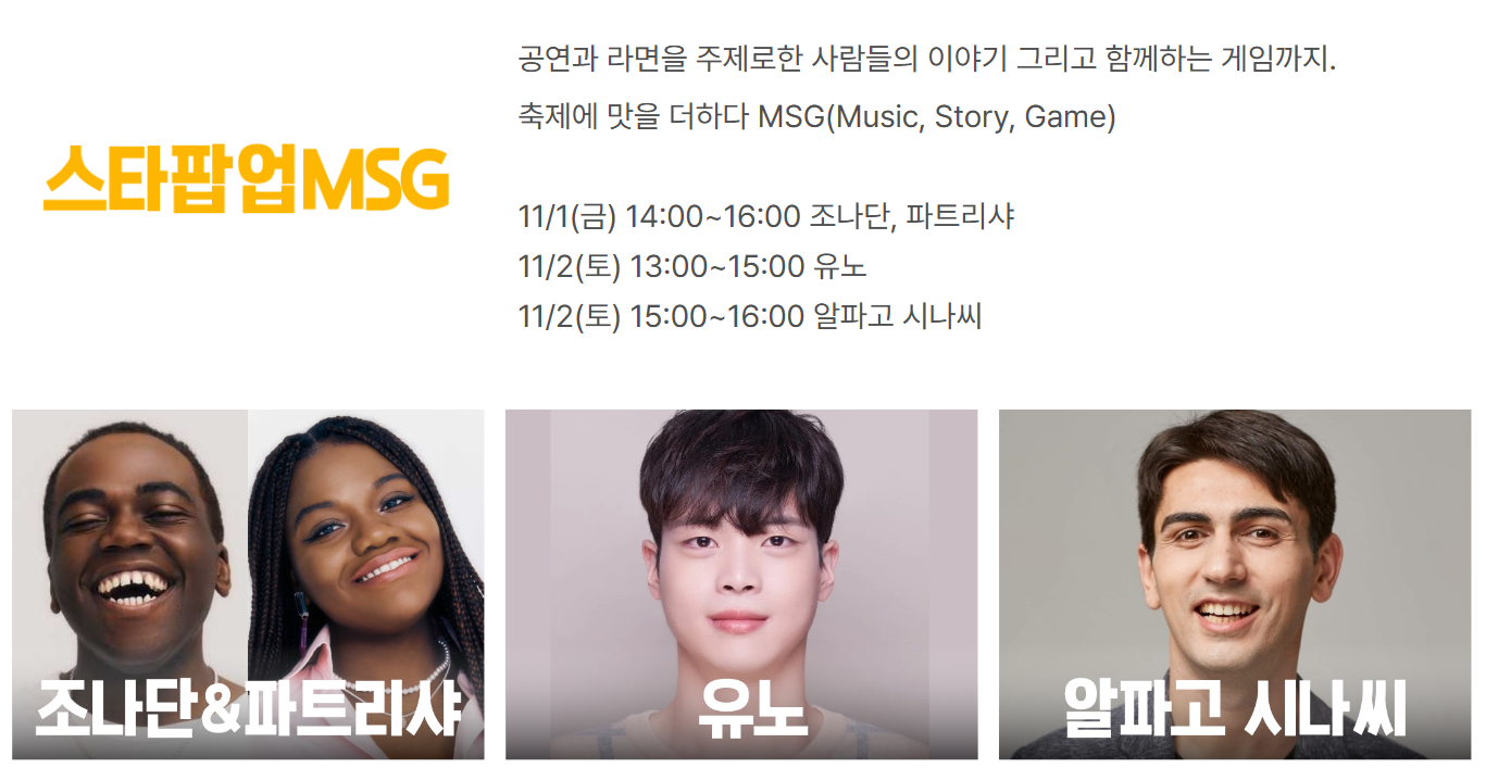 축제의 첫날에는 개막식 축하공연이 열리며, 유명 아티스트들이 무대에 오릅니다. 가수 정인, 송하예, 그리고 잠골버스가 출연하여 여러분의 귀를 즐겁게 할 예정입니다. 또, 서브 무대인 MSG 팝업에서는 조나단과 파트리샤의 공연도 진행되어 축제를 더욱 풍성하게 만들 것입니다.