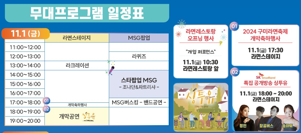 2024 구미 라면축제는 금오산 잔디광장, 문화로, 금리단길, 구미역 후면광장 등 다양한 공간에서 진행됩니다. 이번 축제는 오전 11시부터 오후20시까지 열리며, 특히 첫날인 11월 2일은 오후 7시 조기 마감 예정이니 방문 계획을 세우실 때 참고하세요.