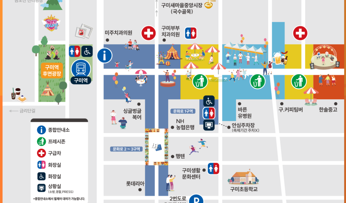 도심에서 진행되는 행사로 행사지역에 주차공간이 별도로 없습니다. 대중교통이용을 추천합니다. 구미역에서 축제장까지는 도보로 쉽게 이동할 수 있으며, 무료 셔틀버스도 제공됩니다. 셔틀버스는 금오산 대주차장, 구미시청, 구미복합스포츠센터에서 출발하며, 정해진 시간에 운영됩니다.