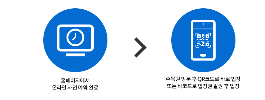 입장방법은 홈페이지에서 온라인 사전 예약을 하고, 수목원 방문 후 QR코드로 바로 입장 또는 바코드로 입장권 발권 후 입장이 가능합니다.