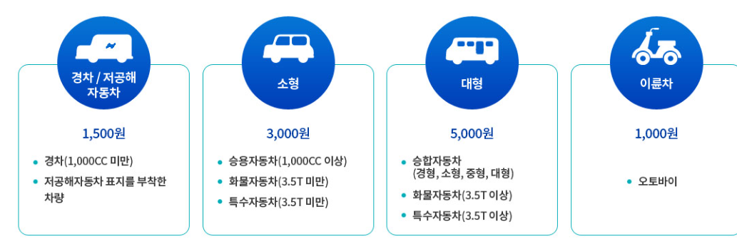 주차장 이용요금은 1일 대형 5,000원, 소형 3,000원, 경차/저공해 자동차 1,500원, 이륜차 1,000원입니다.