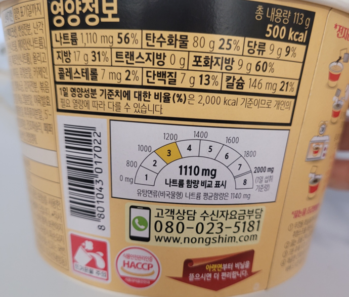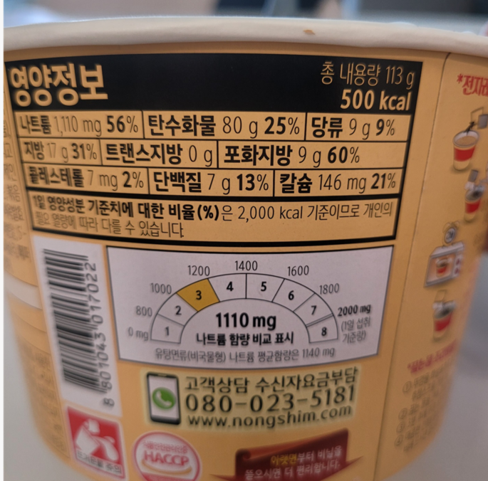 신라면 툼바 컵라면의 영양 정보를 살펴보니, 열량이 500칼로리로 적지 않지만 대부분의 볶음면과 큰 차이가 없어 보였습니다. 포장지에는 고추와 치즈 그림이 그려져 있어, 맛을 미리 예상할 수 있게 해주었습니다. 나트륨 함량은 생각보다 과하지 않았고, 대부분 탄수화물로 구성되어 있지만 나름 단백질도 포함되어 있어서 전반적으로 균형이 잡힌 느낌이었습니다.