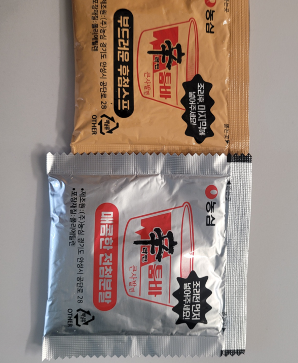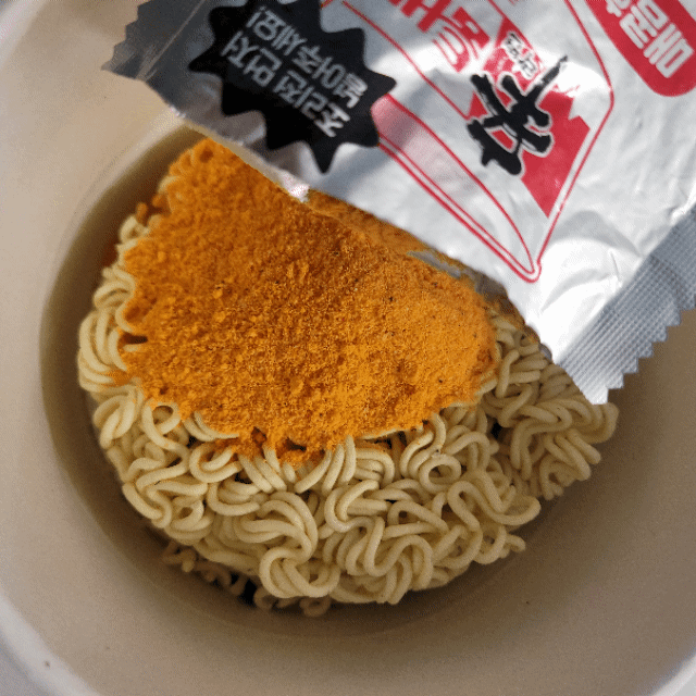 첫 번째 분말을 넣고 끓는 물에 면을 넣은 후 2분 동안 돌리면 됩니다. 전자레인지가 없다면 끓는 물에 면을 익힌 후 물을 버리고 스프를 섞어주면 됩니다. 제가 해보니 물을 완전히 버리면 스프가 잘 섞이지 않더군요. 그래서 약간의 물을 남긴 후에 비비는 것이 좋았습니다. 두 숟갈 정도는 남겨주면 훨씬 잘 섞입니다.