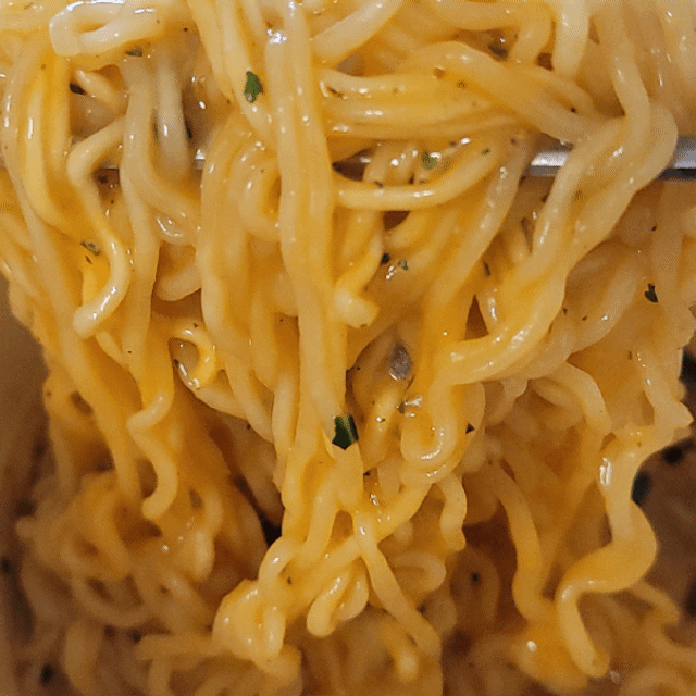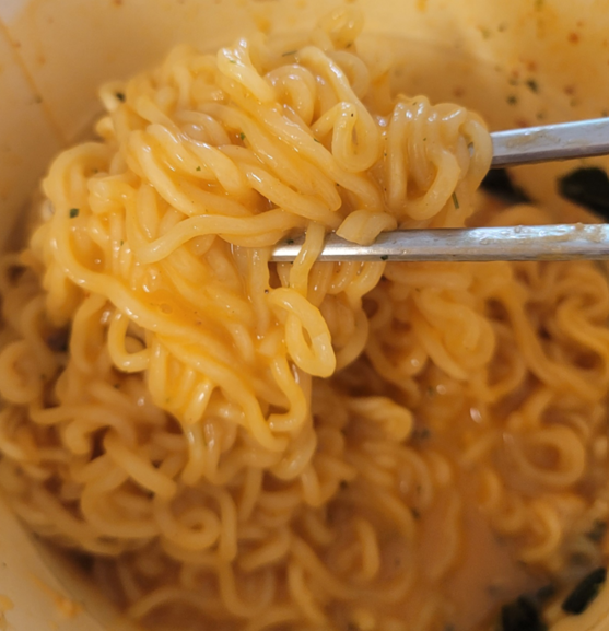 조리 후 비주얼은 약간 치즈볶이 같은 모습이었습니다. 냄새에서는 신라면의 매콤함과 치즈의 냄새가 함께 나면서 군침이 돌았습니다. 전자레인지로 조리해서 인지 더욱 꾸덕꾸덕하고 맛깔스러운 비주얼로 눈길을 사로잡았습니다. 특히 파슬리가 적당히 섞여 있어 더욱 그럴싸하게 보였습니다.