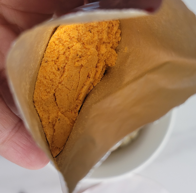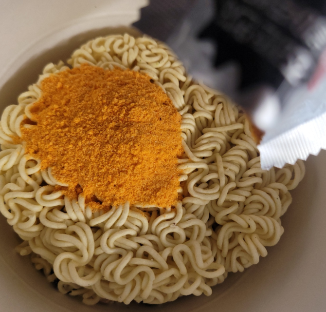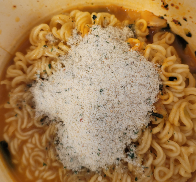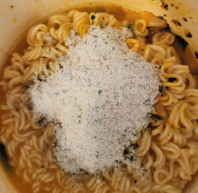 신라면 투움 컵라면은 스프가 두 개로 나뉘어 있었습니다. 조리 전에 넣어야 하는 전첨 분말과 조리 후에 더해야 하는 후첨 스프가 따로 구성되어 있어, 조리 시 주의가 필요했습니다. 전첨 분말은 빨간색으로 매운 향이 강하게 느껴졌고, 후첨 스프에서는 생크림과 파마산 치즈, 체더 치즈의 고소한 냄새가 느껴졌습니다.