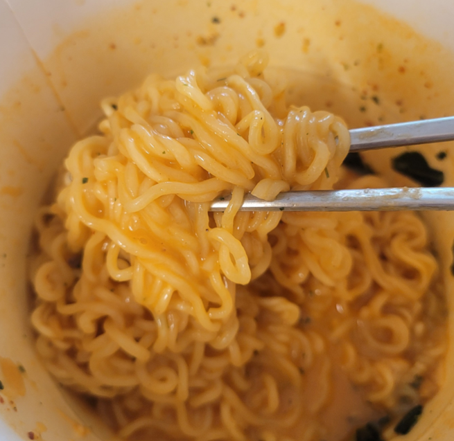신라면 툼바 컵라면은 부드러운 크림 향이 과하지 않게 더해져 있었고, 신라면 특유의 칼칼하고 매콤한 맛을 함께 즐길 수 있어 매우 만족스러웠습니다. 면발은 적당히 쫄깃쫄깃했고, 소스가 잘 묻어나서 제대로 매운 맛을 느낄 수 있었습니다. 중간중간 튀긴 마늘이 씹혀서 그 맛이 더욱 특별했습니다. 이런 크림 소스와 마늘의 조합은 정말 잘 어울린다는 생각이 들었습니다.
