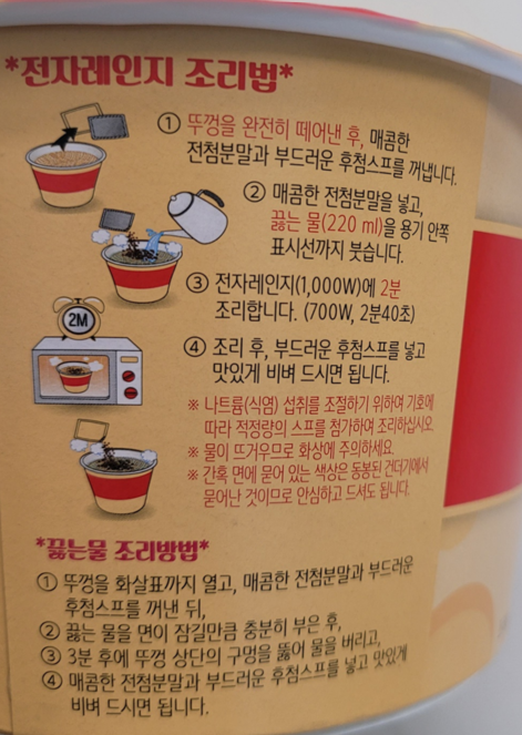 신라면 툼바 컵라면은 두 가지 조리 방법이 있어 선택의 폭이 넓습니다. 특히 전자레인지 조리법이 강조되어 있었습니다. 저는 강조한 이유가 있다고 생각된 전자렌인지 이용한 조리법으로 만들었습니다.
