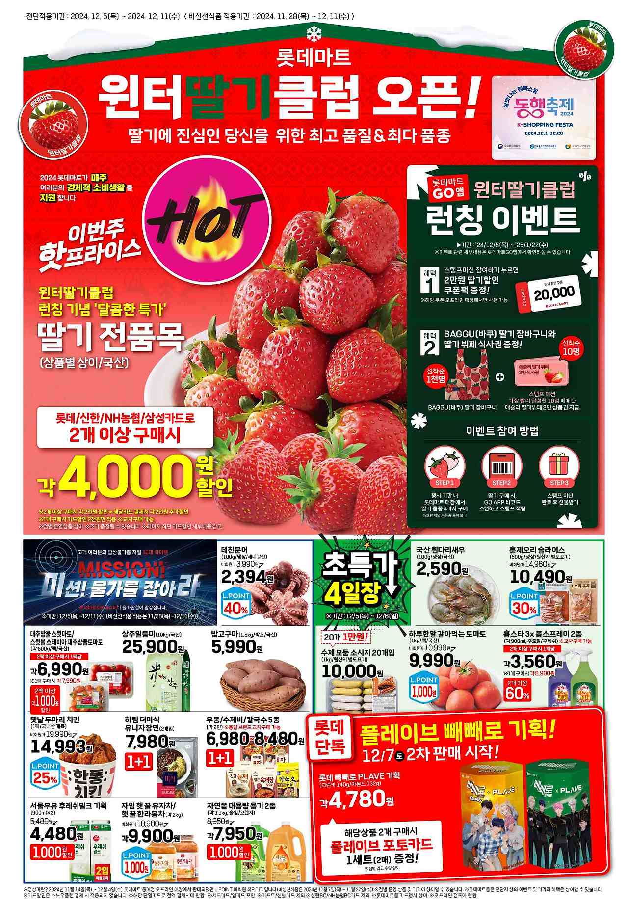 - 딸기 전 품목: 롯데/신한/NH농협/삼성카드로 2개 이상 구매 시 각 4,000원 할인
