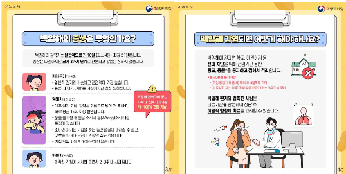 백일해는 주로 어린이에게 발생하는 호흡기 질환으로, 특히 2세 이하의 유아에게 심각한 합병증을 일으킬 수 있습니다. 백일해는 Bordetella pertussis라는 세균에 의해 발생하며, 주로 기침과 재채기를 통해 전파됩니다. 백일해의 주요 증상은 심한 기침 발작이며, 기침이 끝나고 숨을 들이쉴 때 휘파람 소리가 나는 것이 특징적입니다. 이러한 증상은 백일해의 대표적인 징후로, 영어로는 'whooping cough'라고도 불립니다.