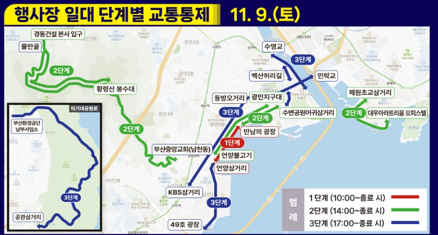 : 광안대교 및 광안리 해수욕장 일대 주요 도로로 행사기간내 교통상황에 따라 탄력적 통제예정으로 홈페이지에서 교통통제 상세 확인을 해주세요.