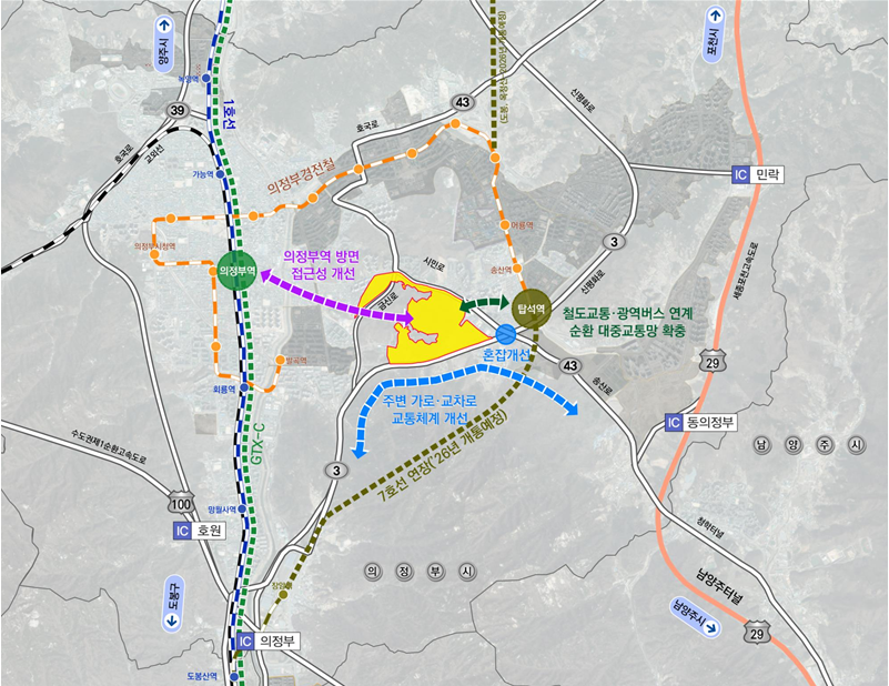 의정부 용현지구는 교통 인프라가 뛰어난 위치에 자리잡고 있어, 주민들에게 편리한 이동 수단을 제공할 예정입니다. 의정부역은 현재 1호선이 운행 중이며, GTX-C 노선이 개통 예정입니다. 또한 회룡역과 탑석역(예정)도 가까운 위치에 있어, 서울과의 접근성이 높아집니다.