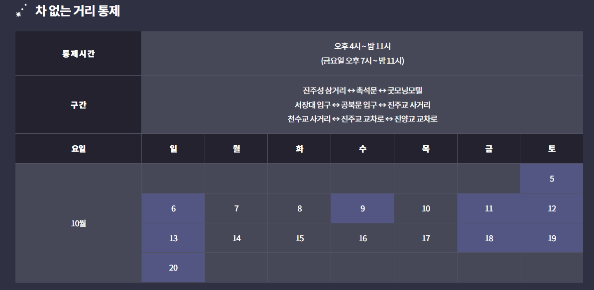 진주 남강유등축제 기간 동안 10월 18일부터 20일까지는 오후 4시부터 밤 11시까지 일부 구간에서 차량 통제가 진행됩니다.