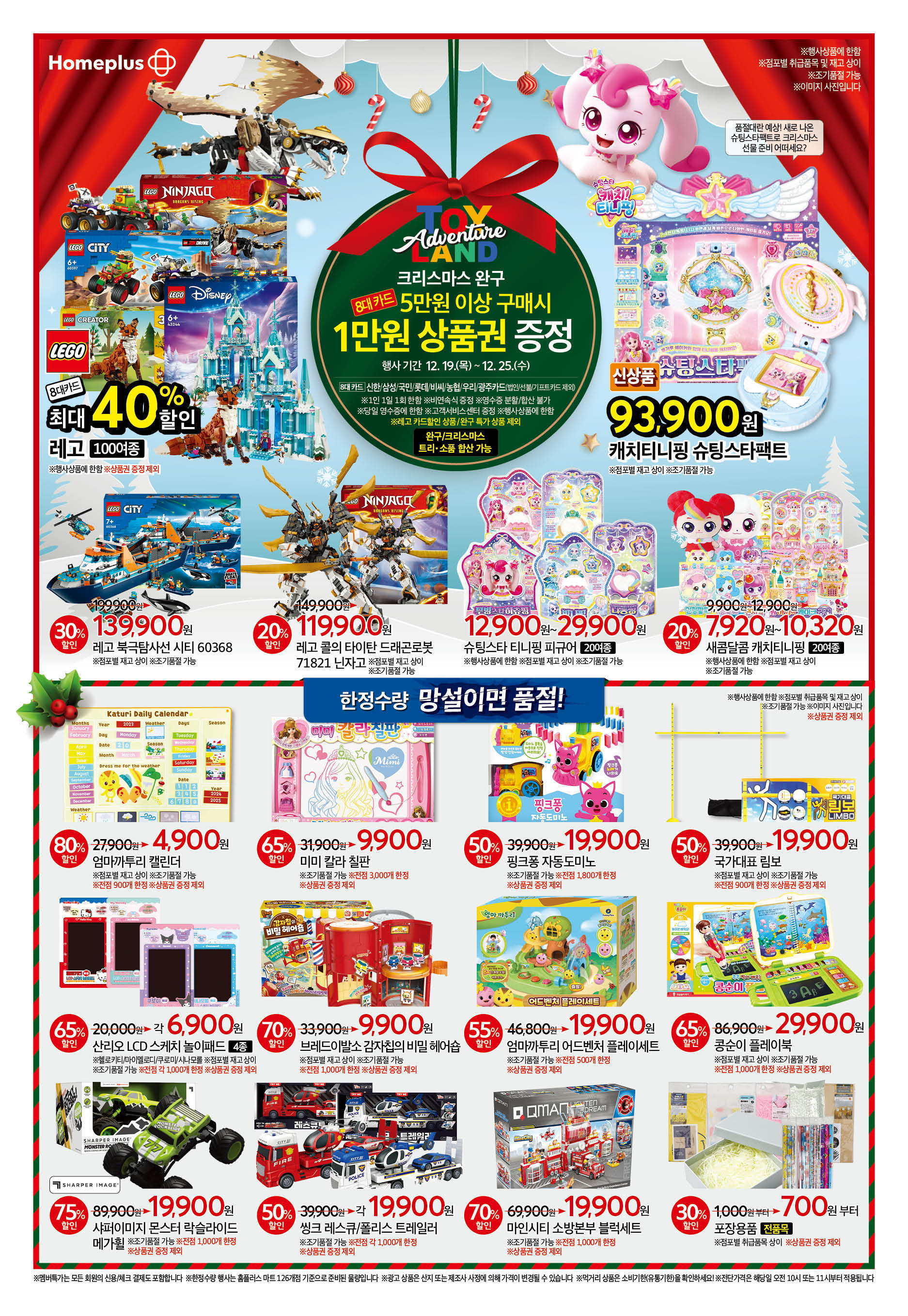 홈플러스가 선보이는 역대급 할인 혜택으로 올해 마지막 쇼핑을 스마트하게 즐겨보세요. 신선한 식재료부터 크리스마스를 더욱 빛나게 해줄 완구와 선물, 그리고 생활 필수품까지 모두를 위한 풍성한 혜택이 가득합니다.