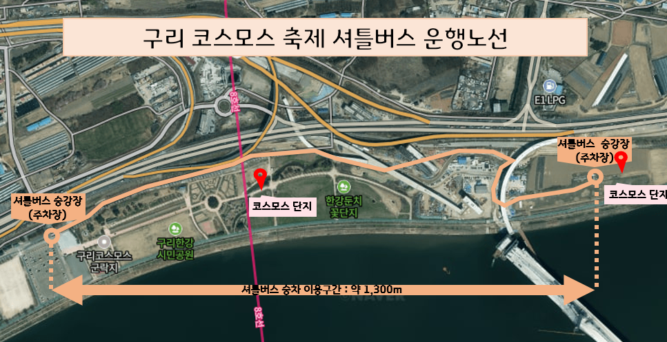 구리 코스모스 축제 기간 동안 대중교통의 편의를 돕기 위해 마을버스 7개 노선이 구리한강공원 축제장까지 연장 운행됩니다.