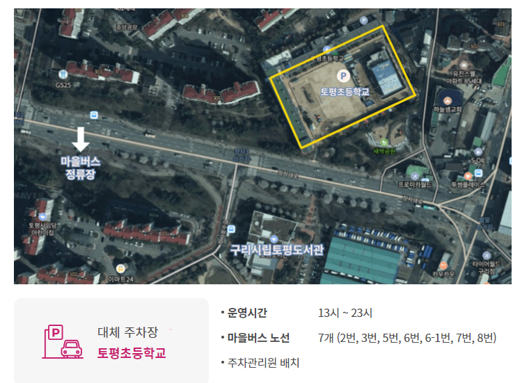 구리 코스모스축제 기간 동안, 많은 사람들이 구리한강공원을 방문할 것으로 예상됨에 따라 토평초등학교 운동장이 임시주차장으로 운영됩니다. 축제에 참석하는 분들은 이곳에 차량을 주차할 수 있으며, 주차 요금은 별도로 부과되지 않아 무료로 이용할 수 있습니다.