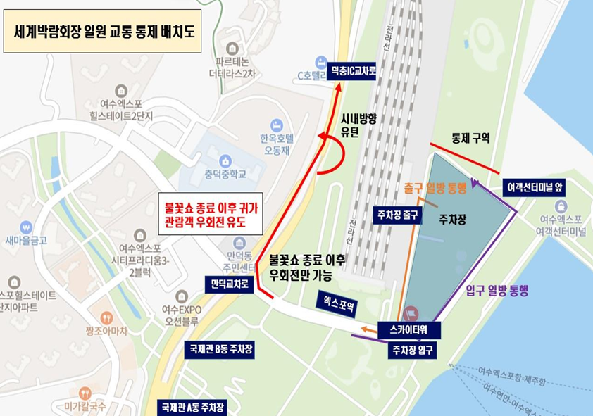 여수불꽃축제 장소인 세계박람회장 근처에 교통 통제가 있을 예정이니 참고하시어 축제를 즐기시길 바랍니다.